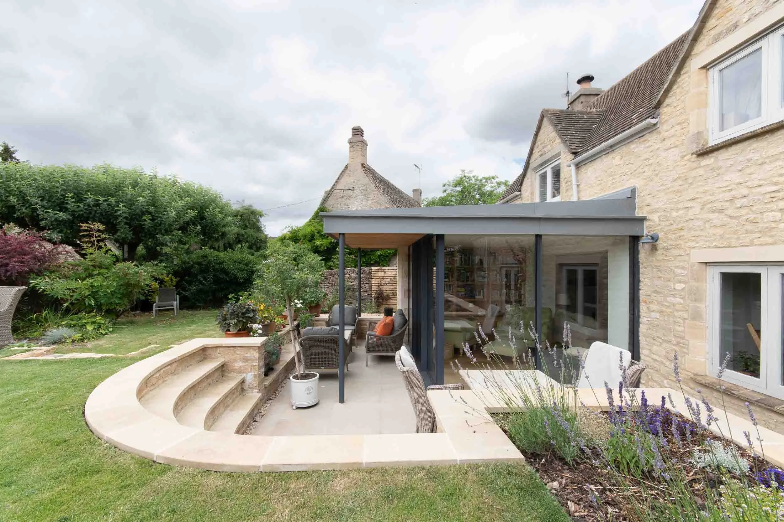 This contemporary cottage extension to a detached period property in Chedworth has transformed the living space to provide extensive views to the attractive gardens, with a sheltered and shaded seating area created below a projecting canopy. A built in bookcase was integrated into the side wall to create the perfect place to sit and relax with a book whilst enjoying the view.