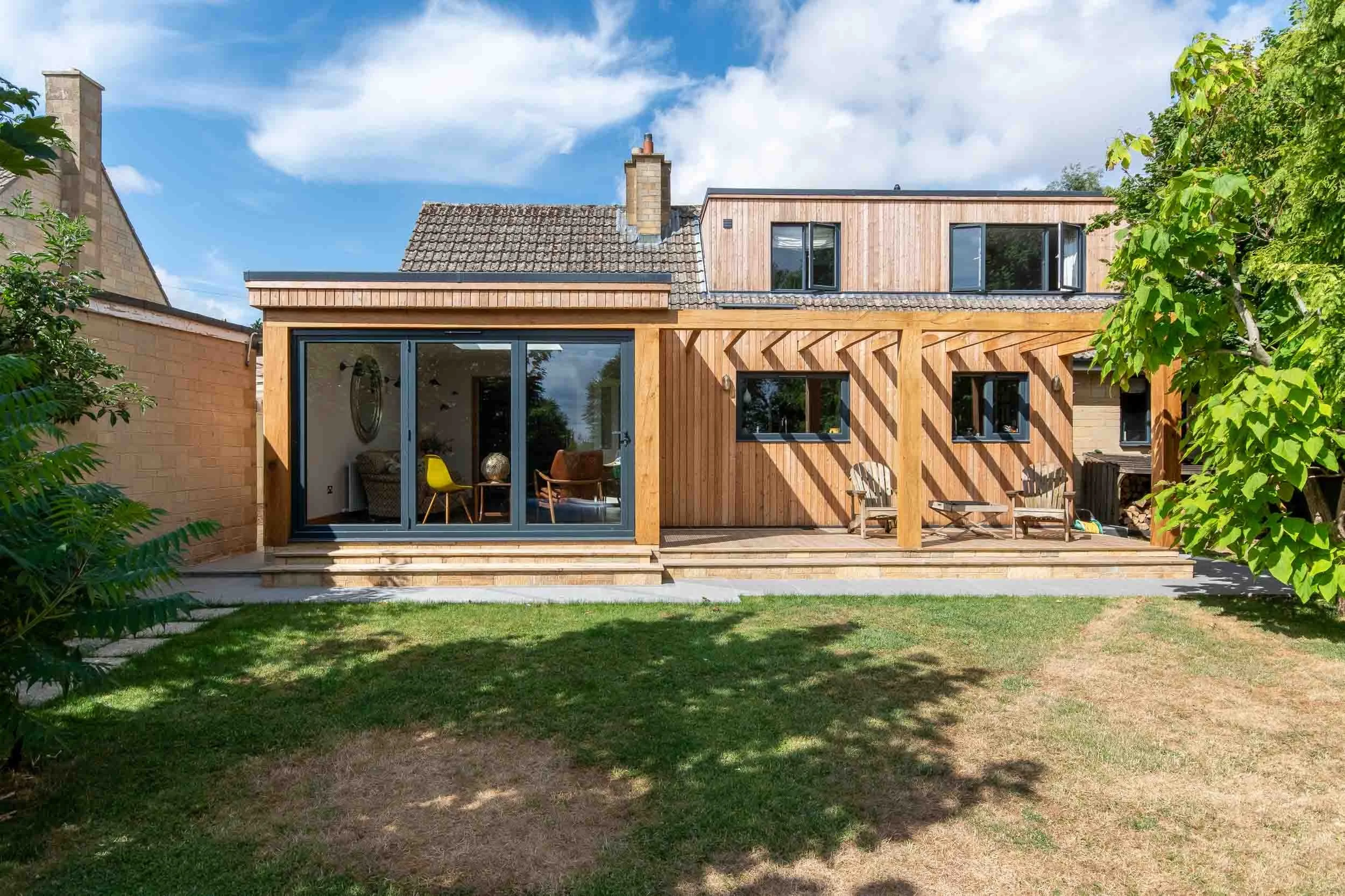 Taking inspiration from architectural styles commonly seen in Australia and New Zealand, the design combines a large corner window with a pergola and decking area. A continuous oak frame ties the two elements together.
