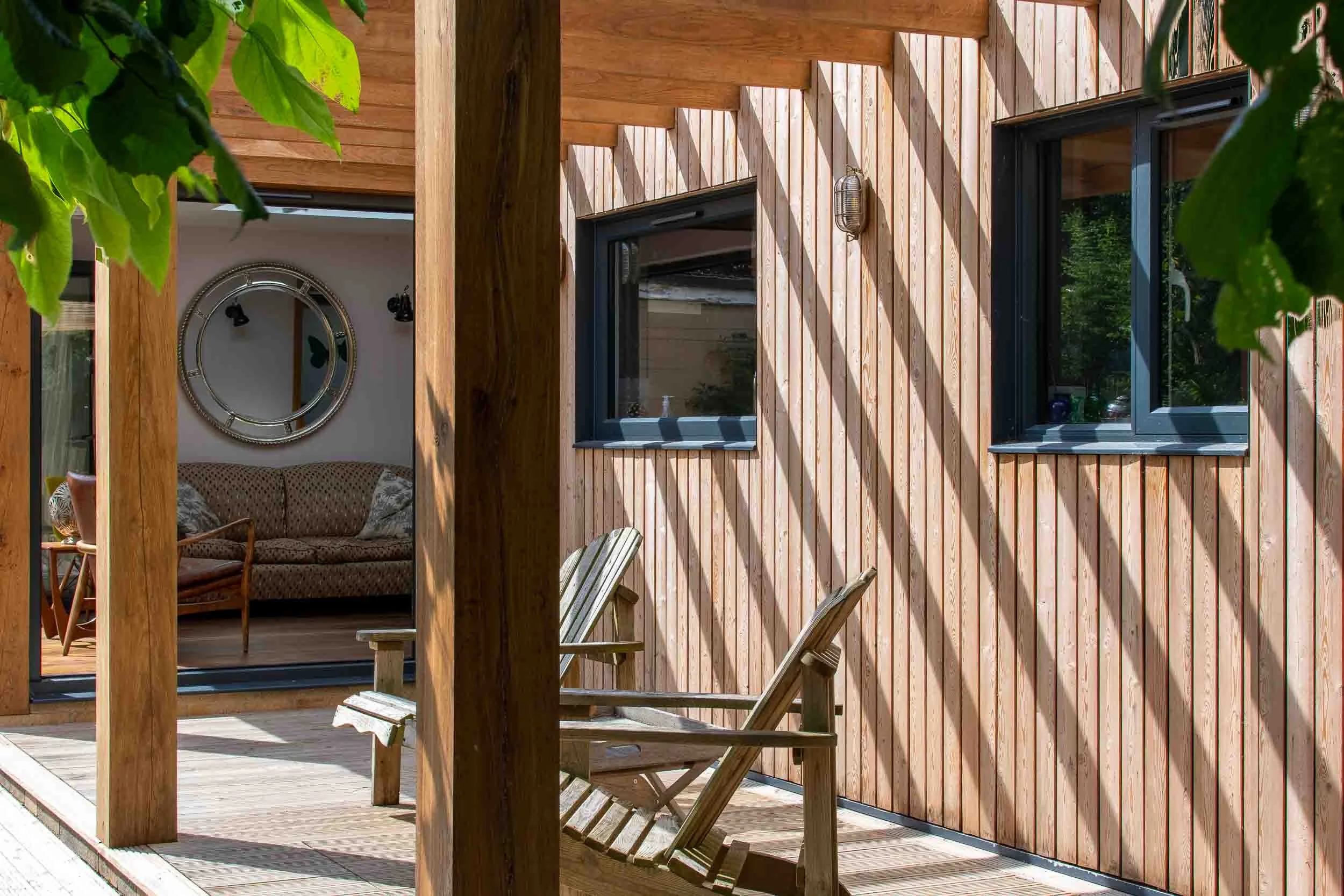 The oak frame pergola casts attractive shadows across the timber clad walls